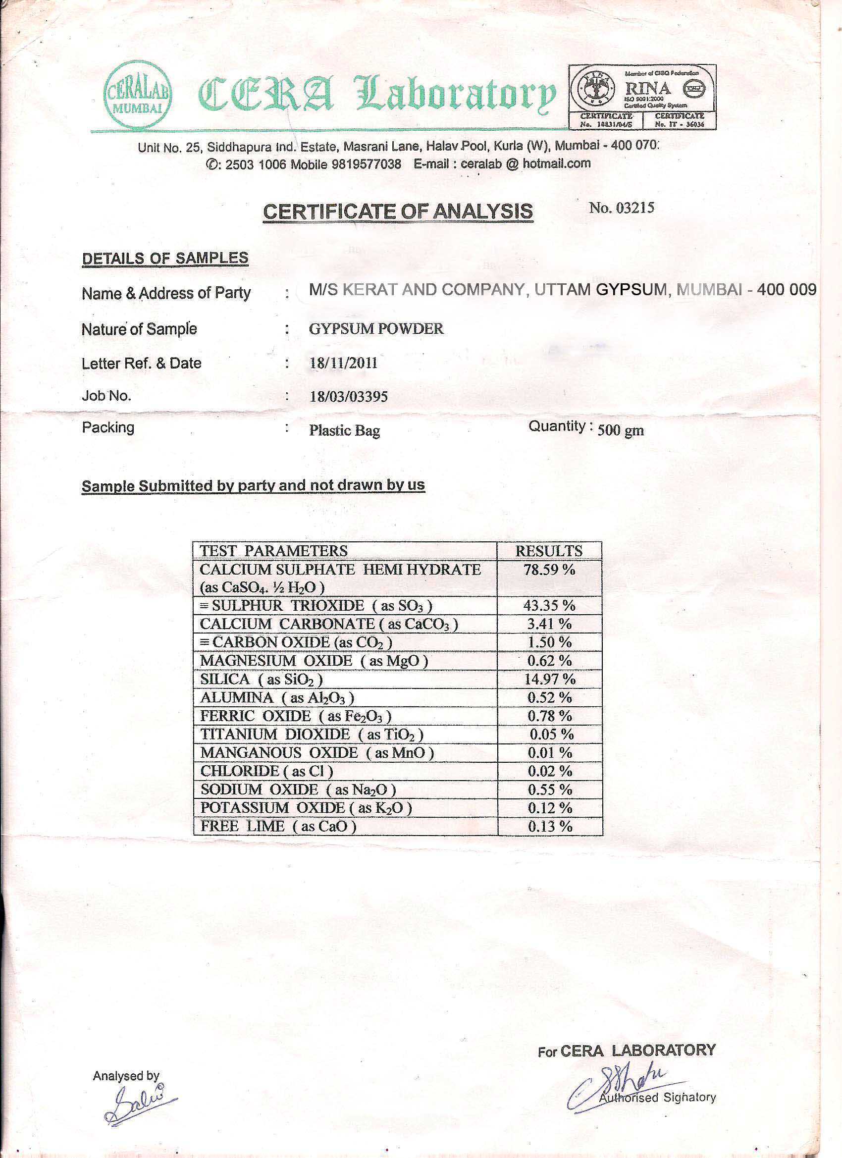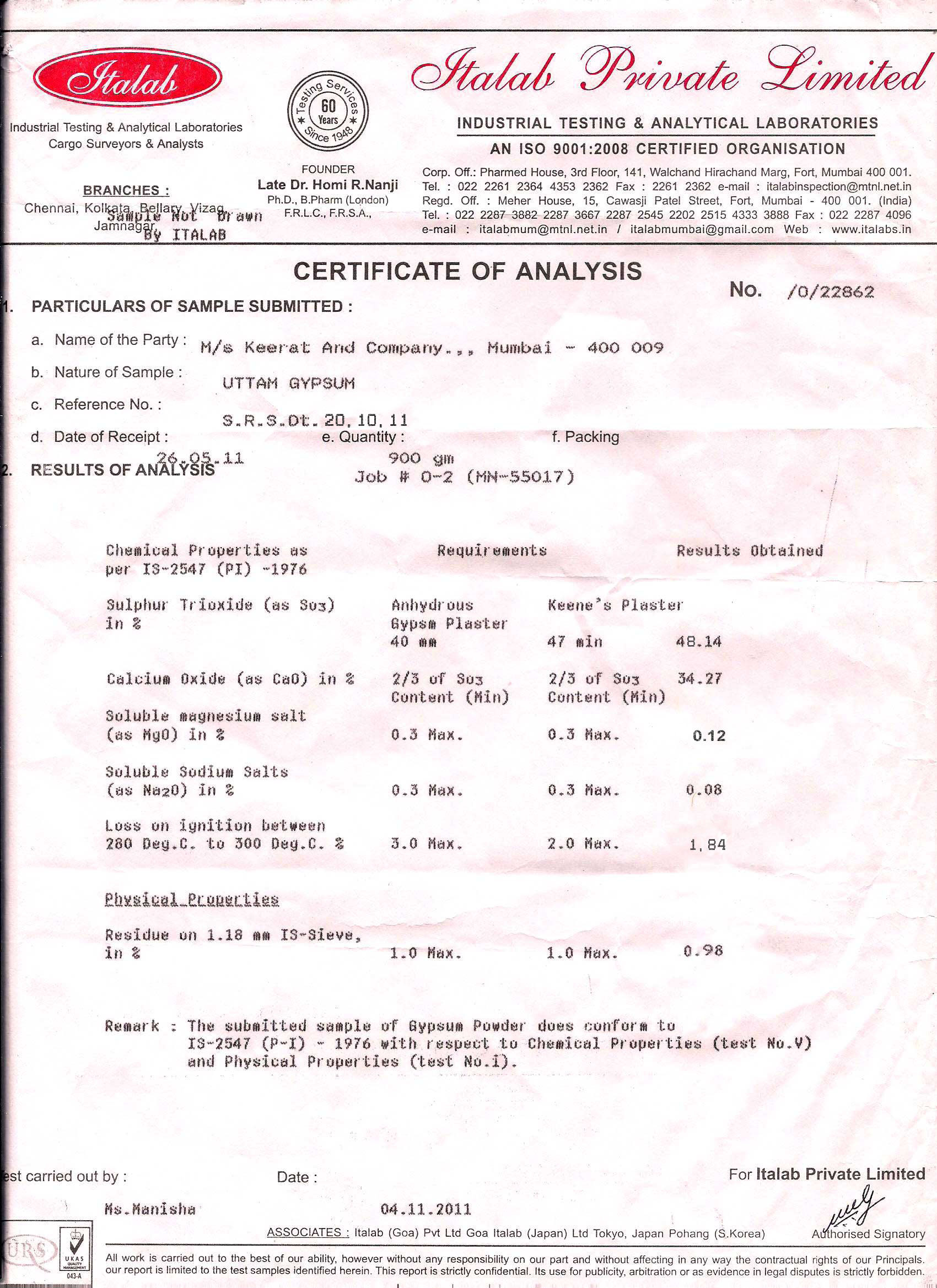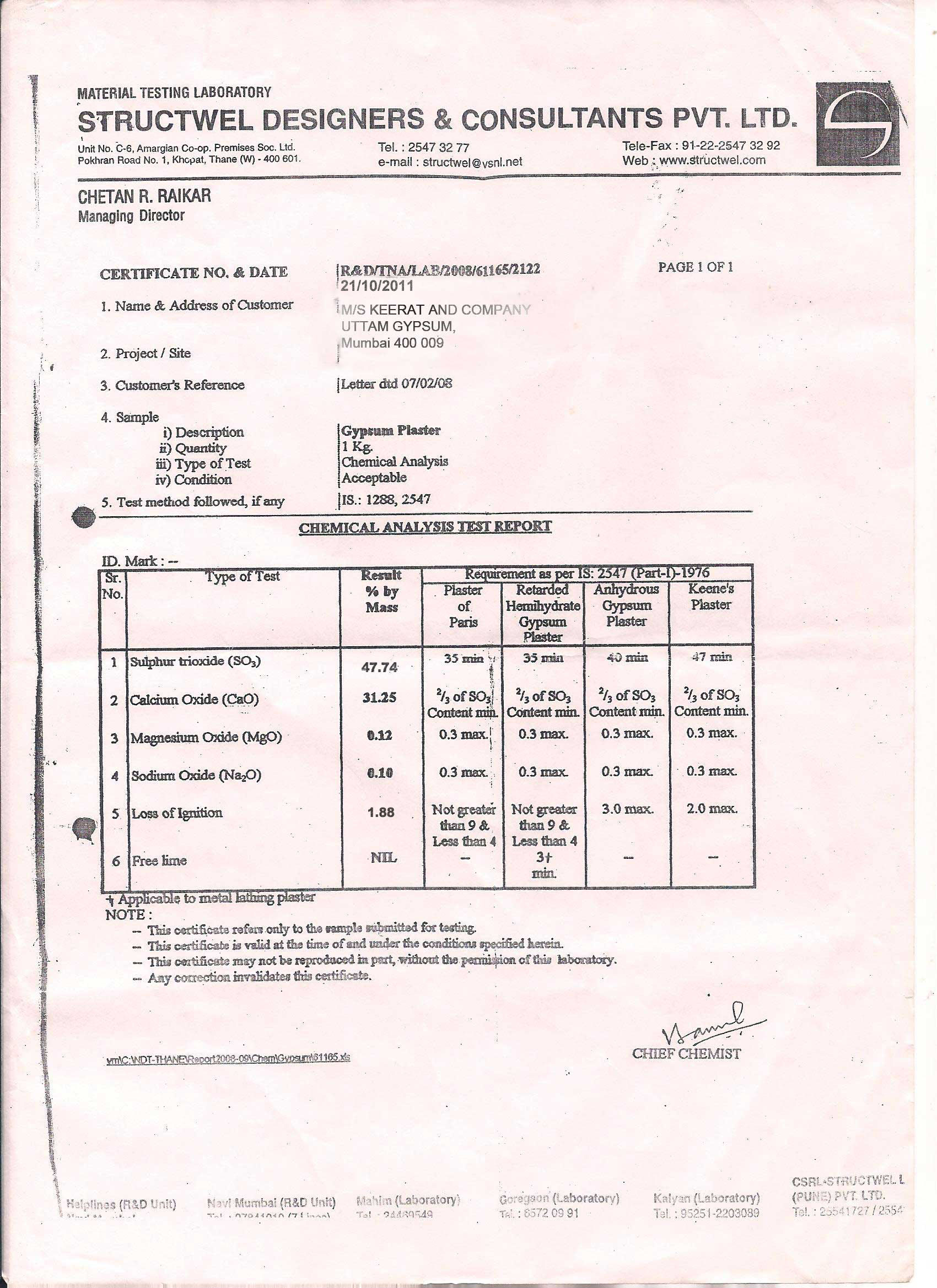 Following attested are a few Test Certificates of our products undertaken by some of the labs. CERA Laboratory Italab Pvt Ltd. Structwell Consultants